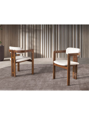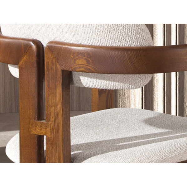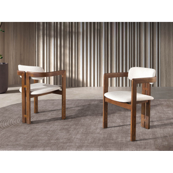 Chaise avec accoudoirs au design moderne, dont l’assise et le dossier sont recouverts de tissu blanc cassé. Ses pieds en bois couleur noyer, d’un style avant-gardiste mais intemporel, en feront un élément incontournable de votre cuisine ou de votre salle à manger. Cette chaise d’Angel Cerdá allie le style unique et personnel de la marque, ainsi que le plus grand confort et la plus grande stabilité, grâce à la haute qualité de son rembourrage et à la structure originale de ses pieds.