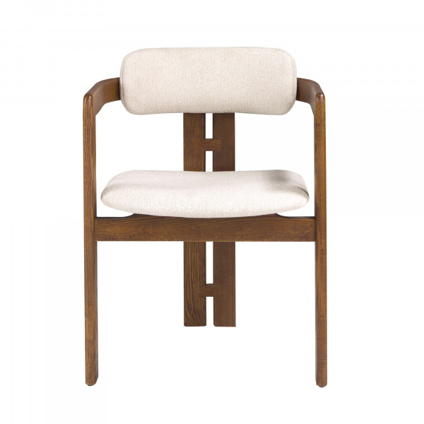 Chaise avec accoudoirs au design moderne, dont l'assise et le dossier sont recouverts de tissu blanc cassé. Ses pieds en bois couleur noyer, d'un style avant-gardiste mais intemporel, en feront un élément incontournable de votre cuisine ou de votre salle à manger.